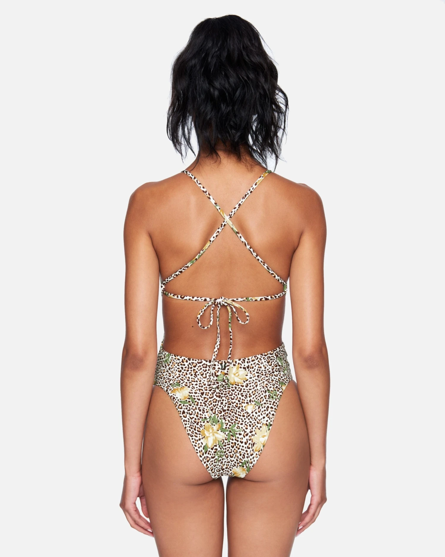 Florals, and animal print, oh my. The Jungle Cat Cheeky One Piece features a low scoop back with adjustable ties, plus cheeky coverage for a flirty fit.