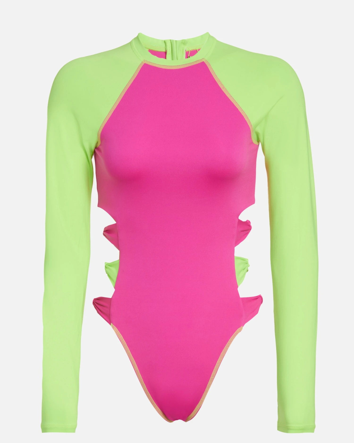 - Color blocked long sleeve surf bodysuit with back zip entry and side bow cutout detail